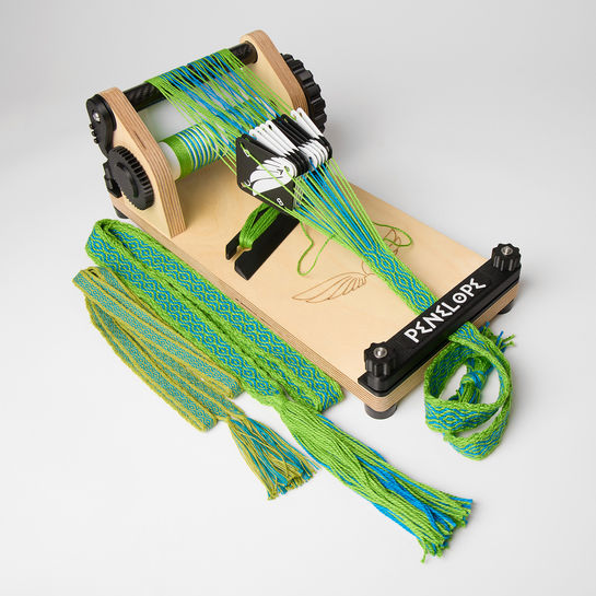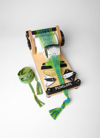 We designed Penelope to be as versatile as possible. For instance, it has both a ratcheting warp beam as well as a rear clamp. The warp beam can hold around 5 yards of warp and separator, but using the rear clamp instead will allow an infinite length of warp draped off the back. So far, we’ve enjoyed testing it using tablets as well as a laser-cut wooden heddle (or two)! It can be firmly planted on a table because of its generously sized rubber feet, but it is still just the right size when it needs to be in your lap. And just like our line of spinning wheels, Penelope was designed to operate with the same smooth precision, as well as having the reliability to last a lifetime.